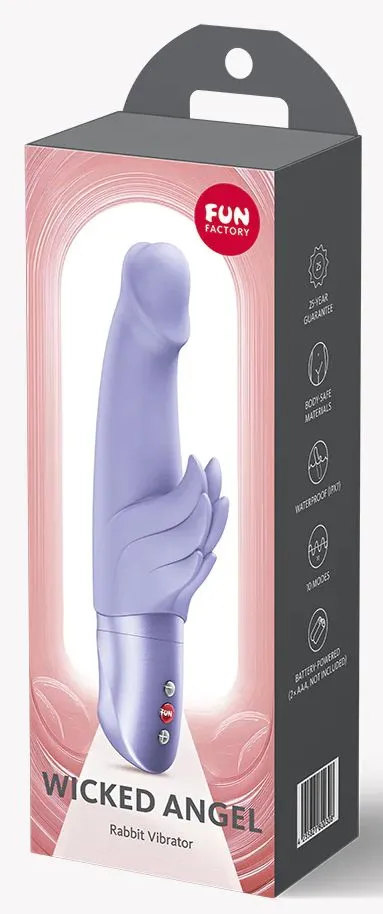 WICKED ANGEL - ваш игривый партнер для незабываемых моментов! Этот вибратор rabbit сочетает в себе смелый дизайн и точную функциональность, что делает его идеальным выбором для тех, кто ищет дополнительных ощущений. Благодаря эргономично изогнутому стержню каждое движение превращается в захватывающее путешествие, возносящее вас к новым высотам удовольствия. Эргономичный дизайн стимулирует точку G, а крылышки, выполненные в виде стимулятора клитора, доставляют возбуждающие импульсы, которые приводят к незабываемым оргазмам. Вы чувствуете приближение кульминации? Благодаря 4 скоростям и 6 захватывающим режимам у вас есть свобода выбора в соответствии с вашими желаниями, в то время как реалистичный стержень, изготовленный из приятного для тела силикона, нацелен на вашу чувствительную точку G, вызывая интенсивные волны возбуждения для получения подлинных ощущений. Для еще более плавного введения и усиления ощущений мы рекомендуем использовать смазку на водной основе. Благодаря водонепроницаемой текстуре (IPX7) WICKED ANGEL готов к игре где угодно – от кровати до ванны или душа. Батарейки (2 × AAA, не входят в комплект) обеспечивают надежное питание, поэтому вы всегда будете готовы к следующему приключению – будь то в гостиничном номере или во время соблазнительного свидания на свежем воздухе. Добро пожаловать в мир удовольствий.